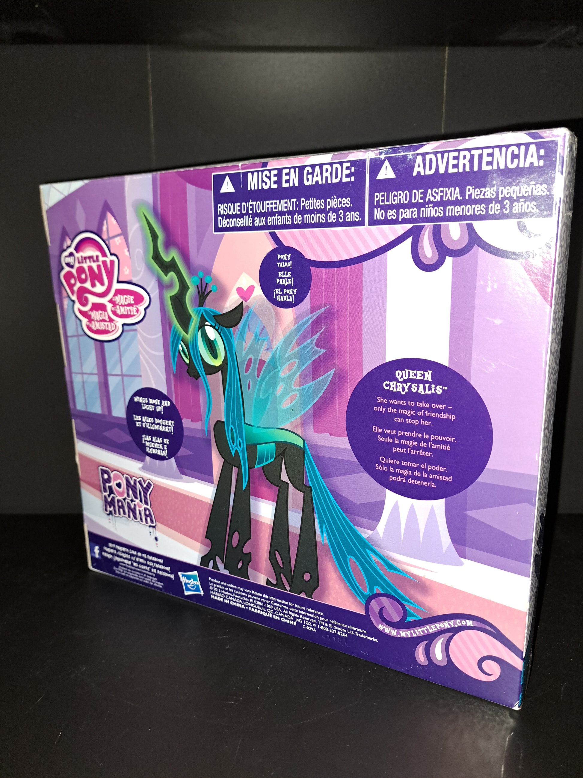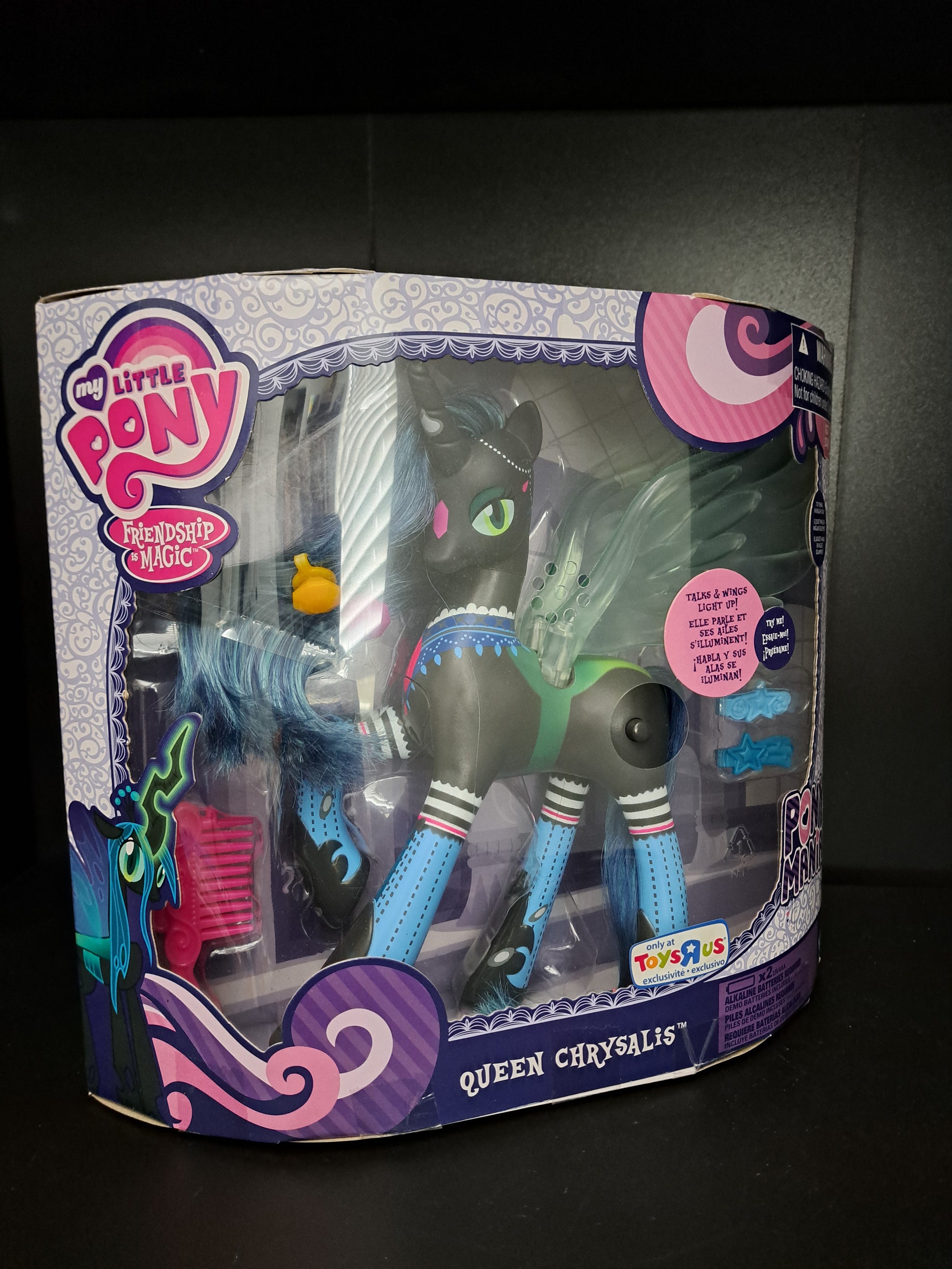 The product is a 2014 My Little Pony Queen Chrysalis action figure, exclusively released by Toys "R" Us. It is a multicolor plastic figure from the My Little Pony Friendship Is Magic franchise. This original action figure features Queen Chrysalis from the TV show "my little pony" and was manufactured in the United States during the time period of 2010-2019